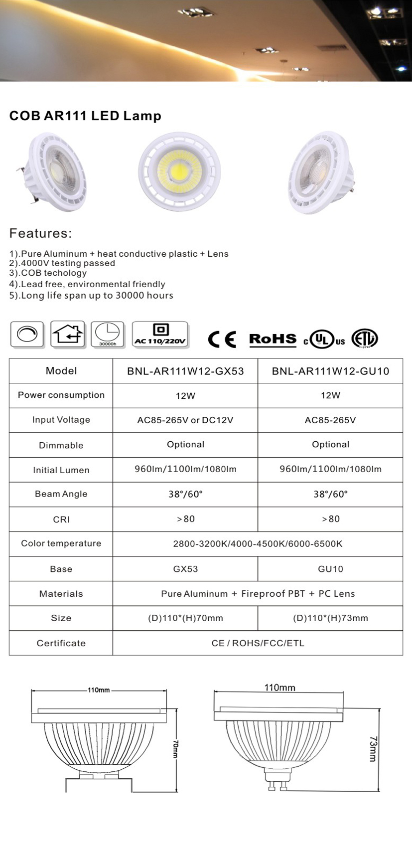 High Brightness 12W 1000lm COB LED AR111 Lamp